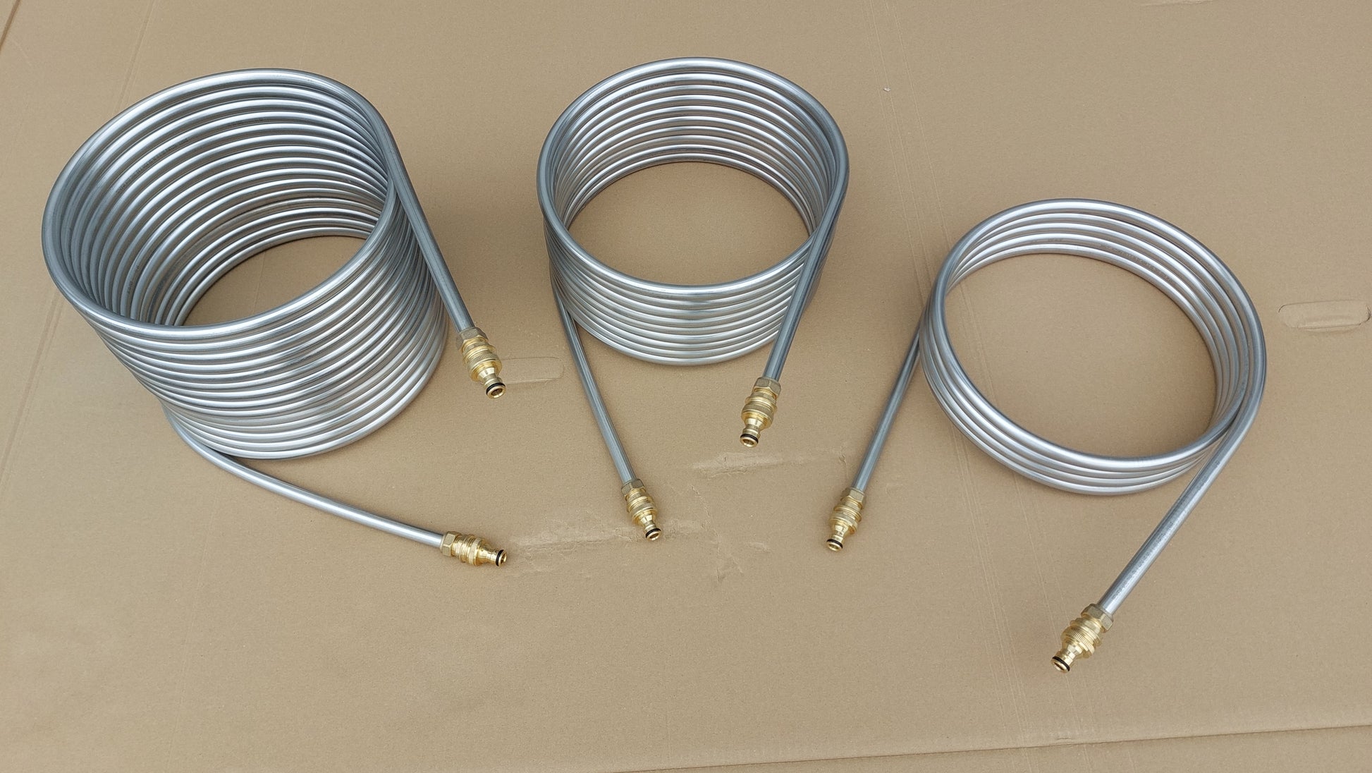 Spirale aus 15 Meter Edelstahlrohr 16x1mm mit einem Außendurchmesser von ca. 32,5cm mit 3/4 Zoll AG AUßENGEWINDE, GARDENA ANSCHLUSS und 32er Poolschlauch TÜLLE aus Messing die als Poolheizung in einer Feuertonne oder Feuerschalle verwendet werden kann. Die Anschlüsse sind aus Messing, sollten aber von der Feuertonne auf Entfernung angeschlossen werden.